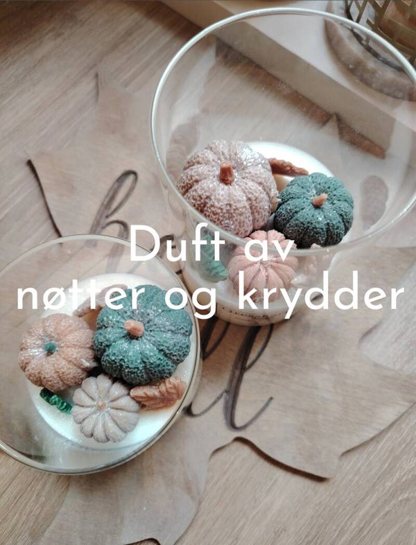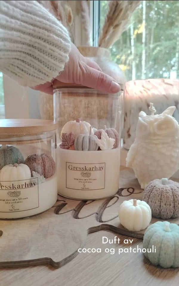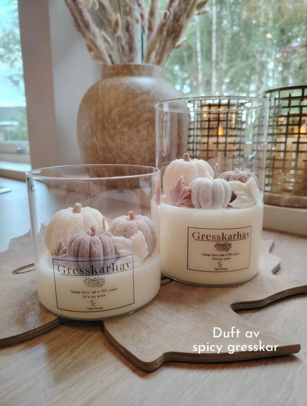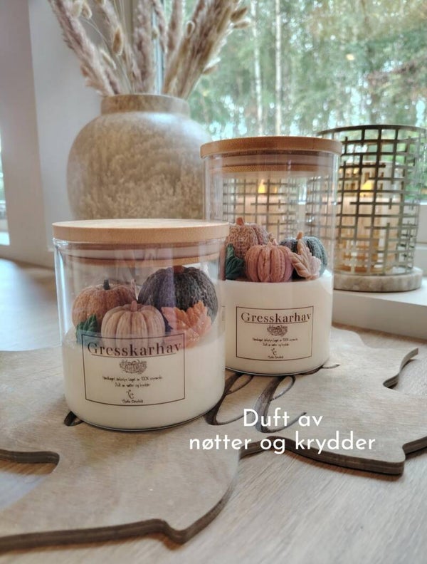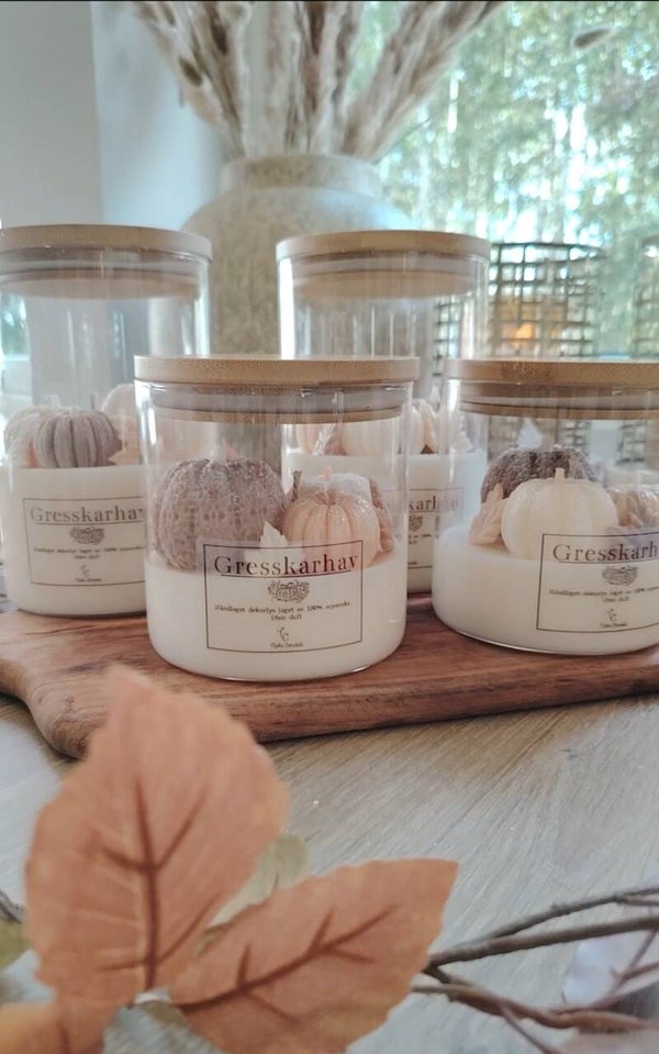 Nydelige store soyavokslys med søte små gresskar i ulike størrelser og farger på toppen, dekorert med små blader. Lokk følger med.