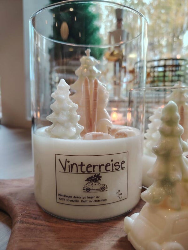 Et soyavokslys med skikkelig vinter dekor - votter, lue, ski, bil med tre på i lune farger som grønn, brunt og hvitt. Dufter deilig og mild chasmier, 4%duftolje.