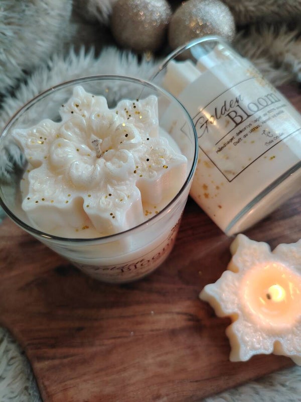 Nydelig juleblomst lys dekorert med gull og dufter deilig sitrus, nellik og kanel. Et enkel, men dekorativt soyavokslys som glitrer I de mørke timer.