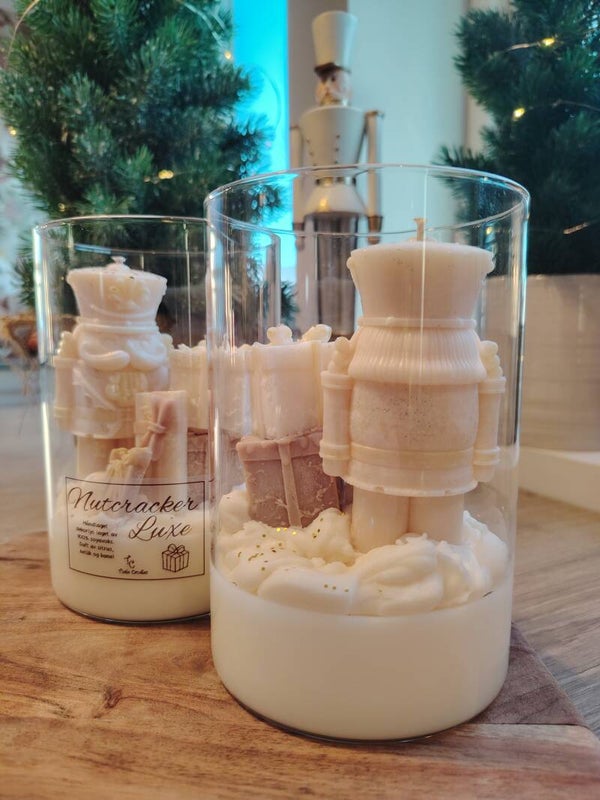 Et luksuriøst lys med stor nøtteknnekker, pyntet opp med masse gaver og gull detaljer. Dufter en mild luksuriøs duft av anis, grønne blader og sitrus. 4% duftolje. Der er ikke tilsatt duftolje i dekoret som nøtteknnekkeren og pakkene.