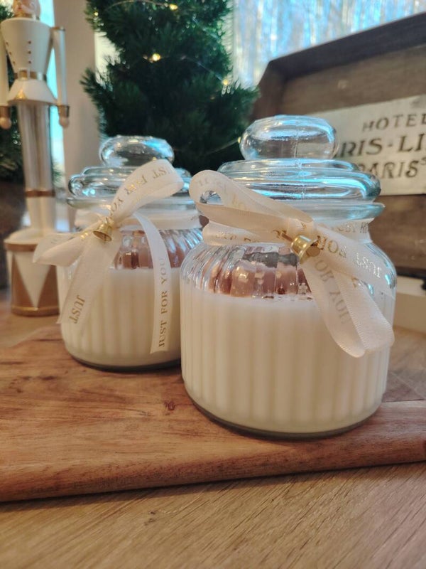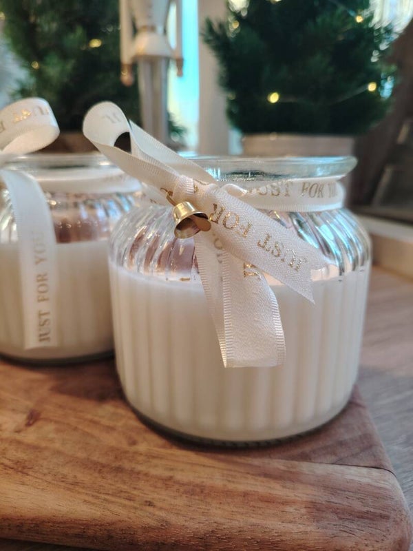 En søt og dekorativ krukke fylt med ren soyavoks og deilige dufter toppet med søt dekor i beige.