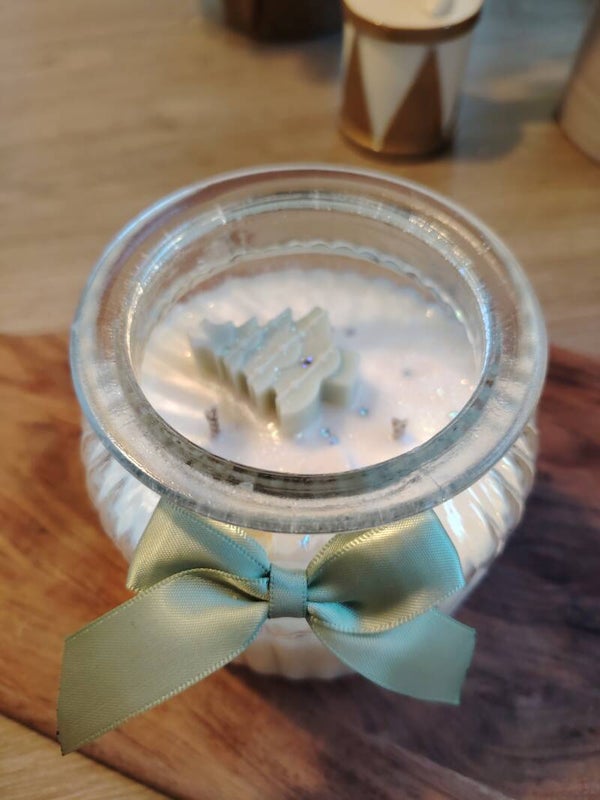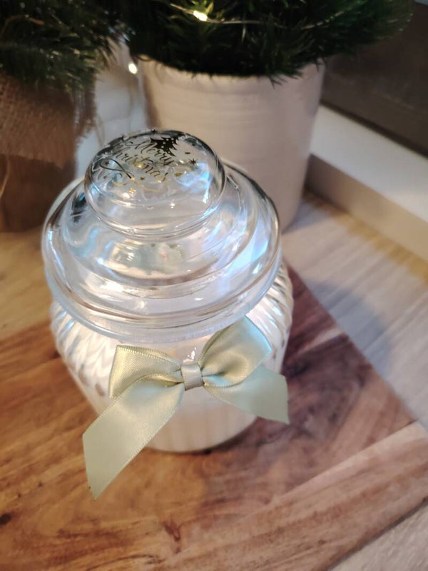 En søt og dekorativ krukke fylt med ren soyavoks og deilige dufter toppet med søt dekor av juletre og en pakke.