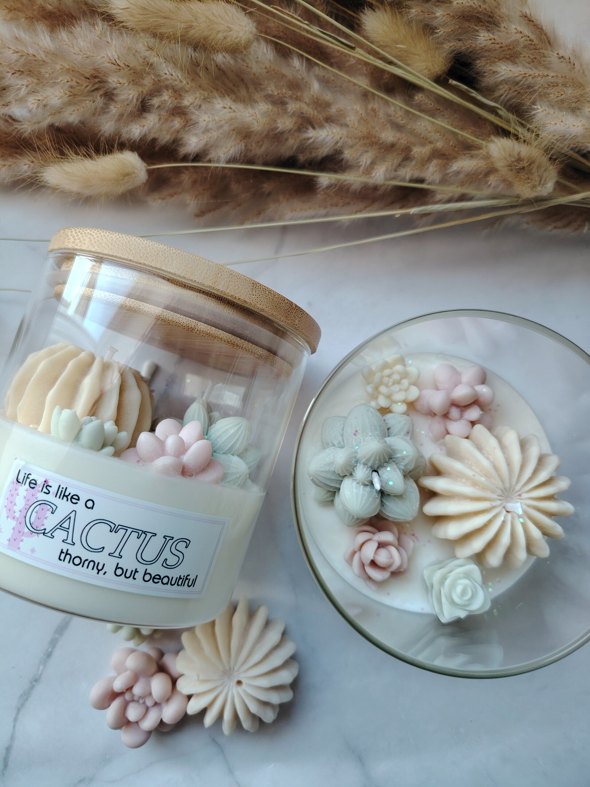 Nydelig kaktus soyavokslys i duse farger og litt rusty look og med søt tekst "life is like a cactus, thorny, but beautiful". Med en sensuell og beroligende blanding av frisk fransk lavendel, kamille og vaniljestang.