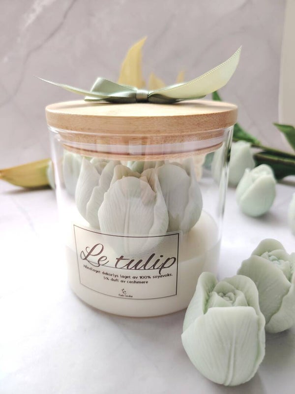 Skap en myk og stemningsfull atmosfære med dette håndlagde tulipanlyset. Delikate tulipanene er støpt i 100 % soyavoks, plassert i et stilrent glass med lokk i bambus og silkebånd.
