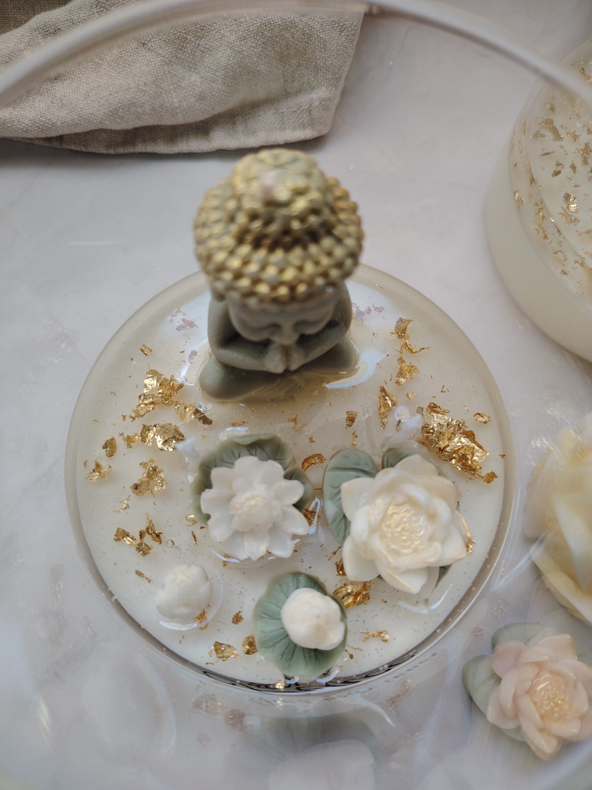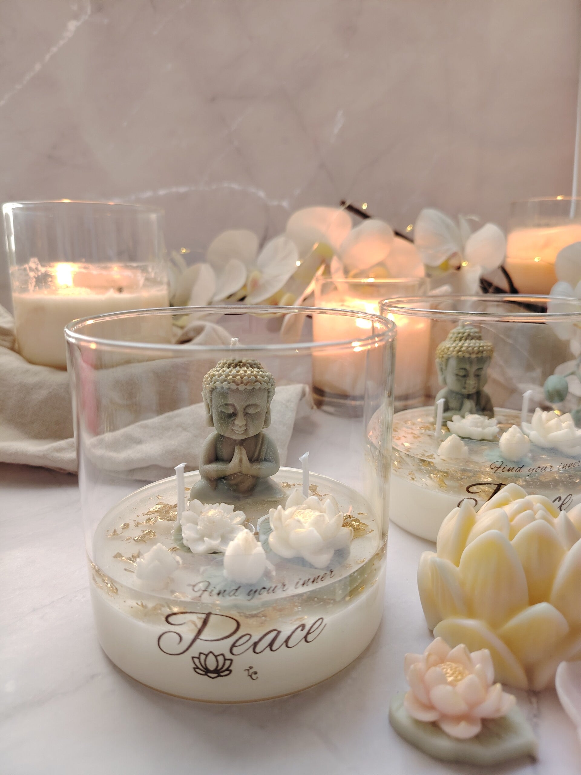 Lyset er håndlaget i delikat soyavoks, dekorert med en rolig Buddha-figur, myke lotusblomster og subtile detaljer i gull. Et design som inviterer til stillhet, tilstedeværelse og et lite pusterom i hverdagen.